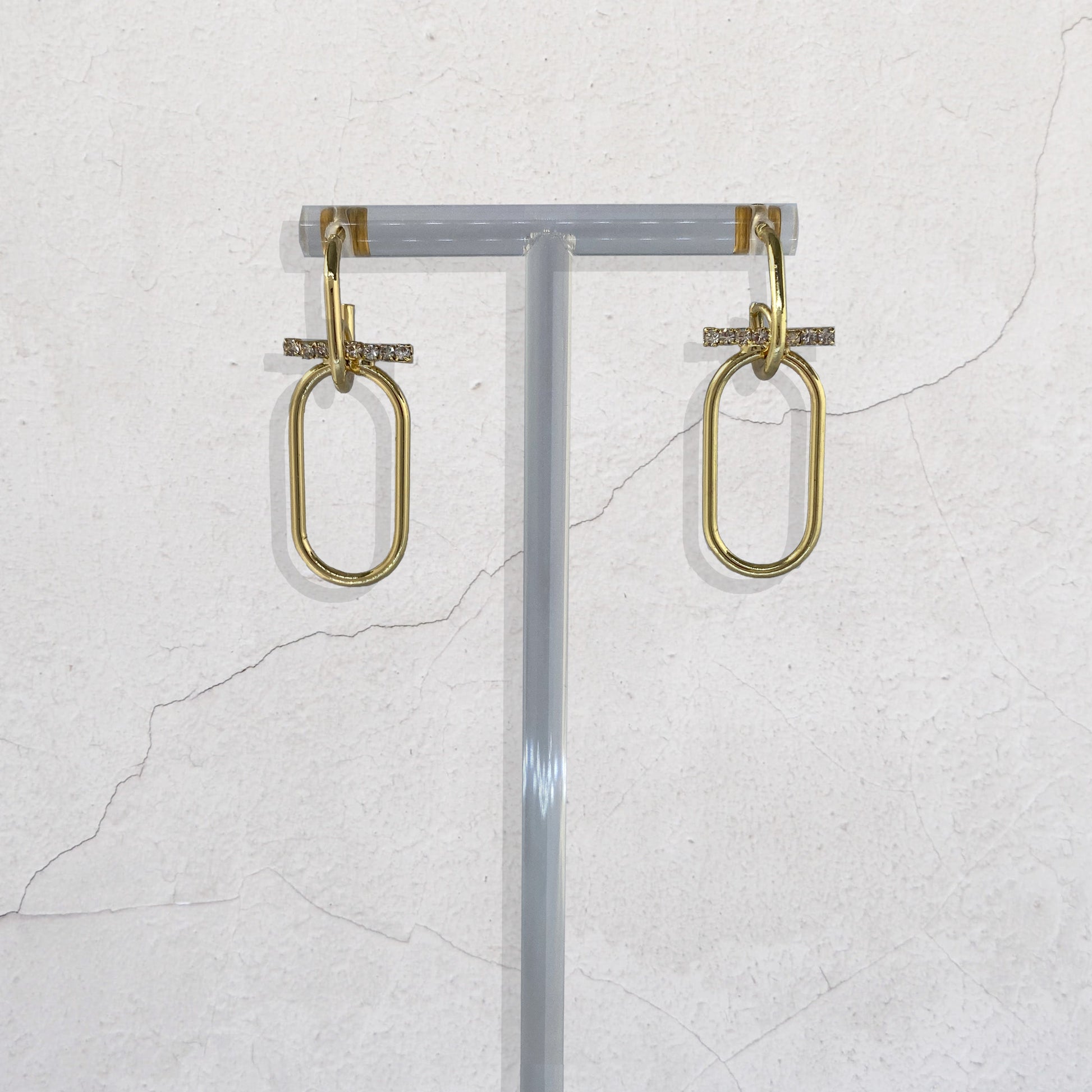 Each earring combines a polished gold-tone elongated oval drop with a delicate CZ diamond bar, creating a refined yet bold silhouette. The result is a statement piece that feels modern, versatile, and chic, perfect for dressing up a daytime look or elevating an evening outfit.