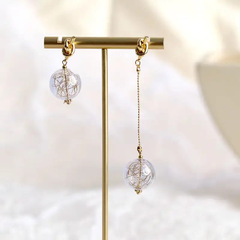 Each earring begins with a polished gold-tone knot stud. From there, clear glass orb pendants with a subtle purple tint reveal delicate metallic swirls inside. One side drops in a dramatic long-chain design, while the other keeps it short and chic — striking the perfect asymmetrical balance.