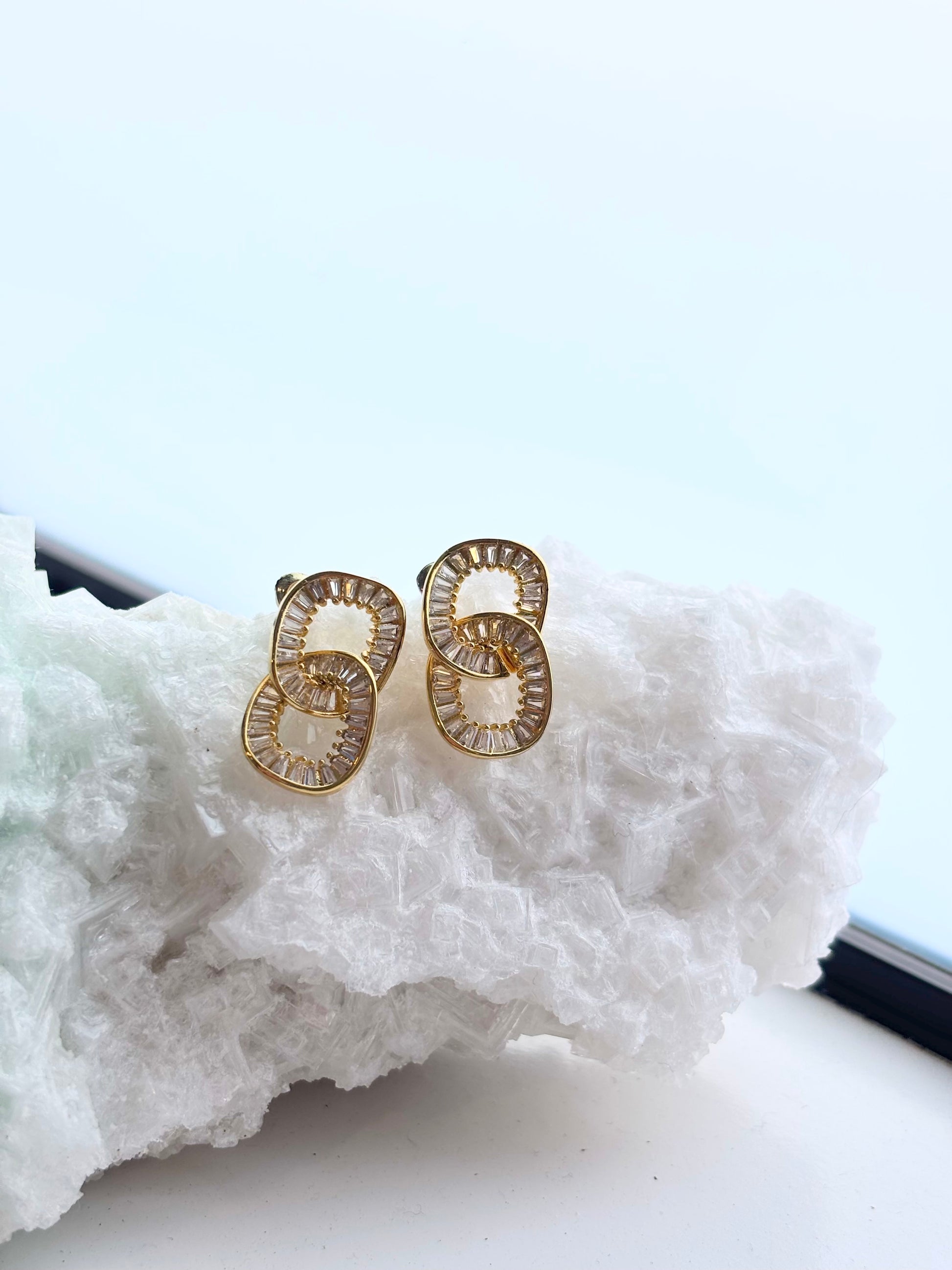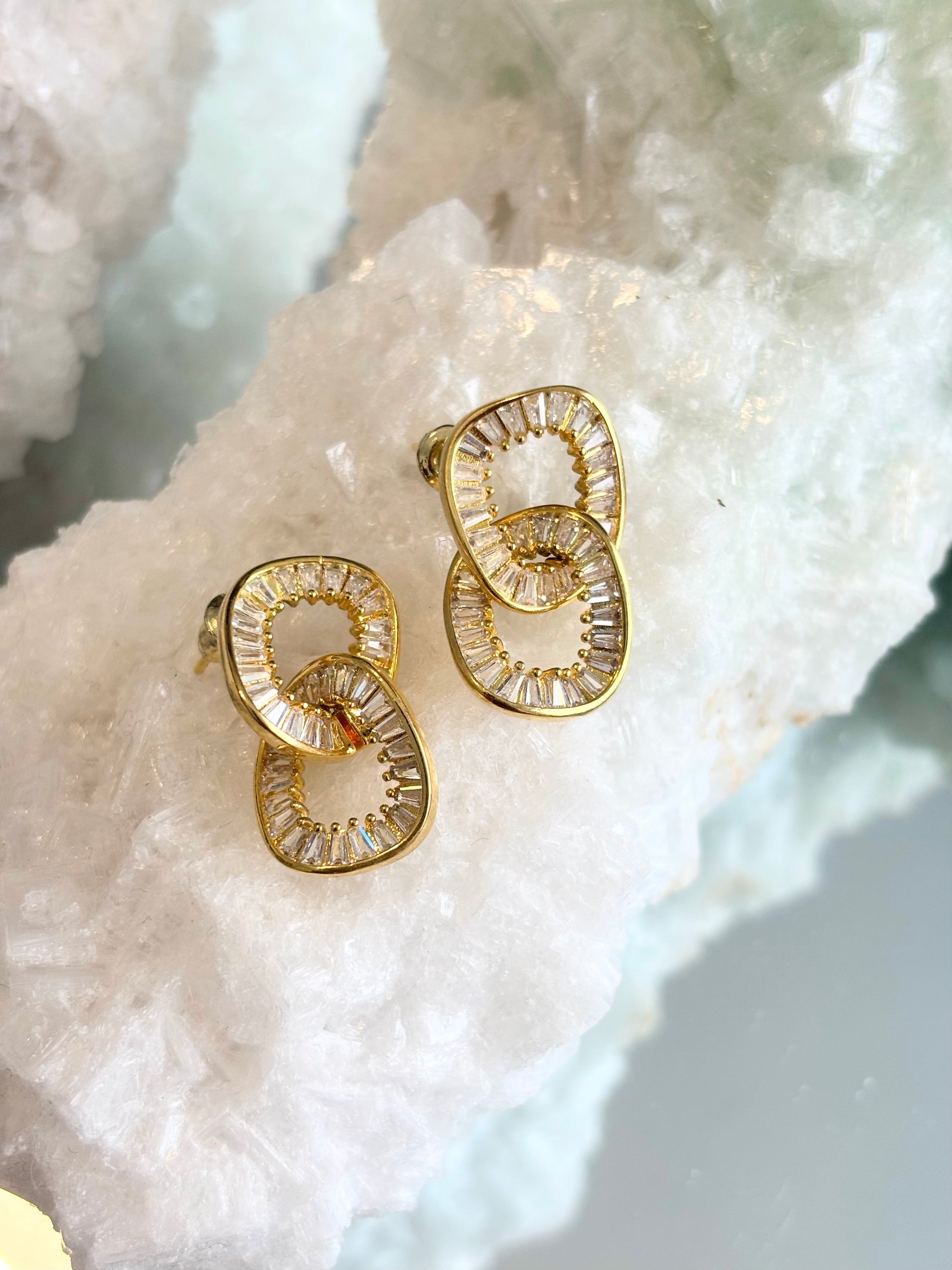 Each earring features two interlinked loops in polished gold-tone, delicately lined with brilliant crystal baguettes that shimmer with every movement. The sculptural silhouette makes them a standout piece, while their medium size keeps them perfectly wearable from day to night.