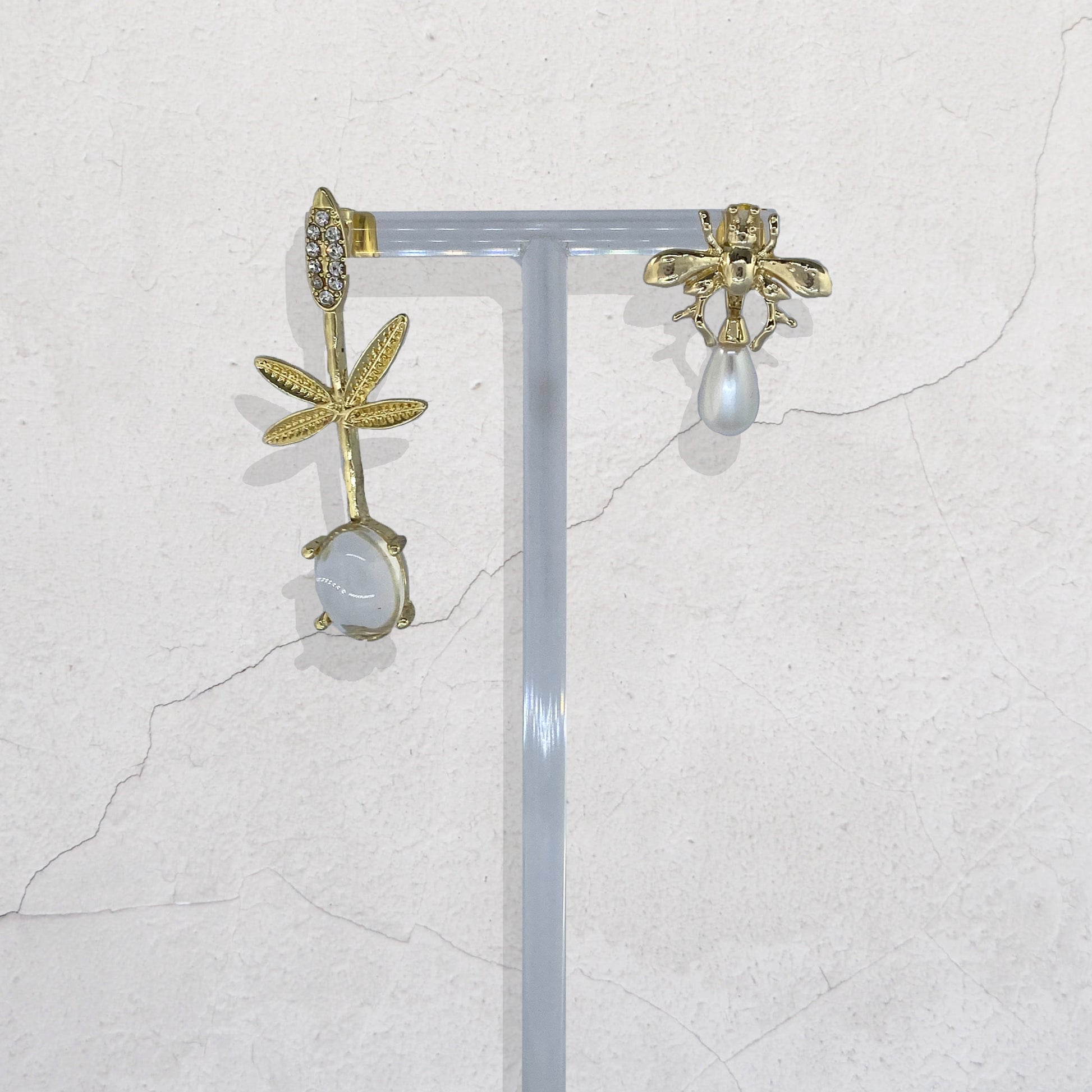 A gold bee stud, crafted with sculptural wings and finished with a lustrous pearl-like teardrop charm.