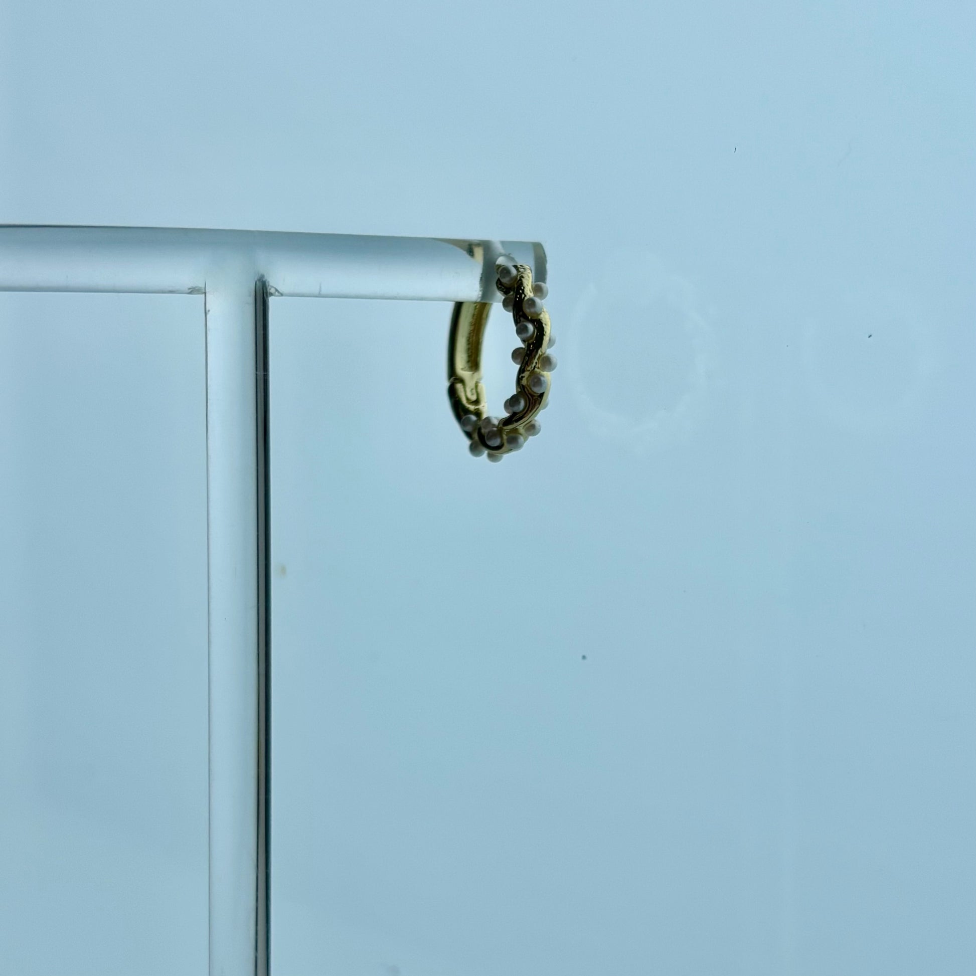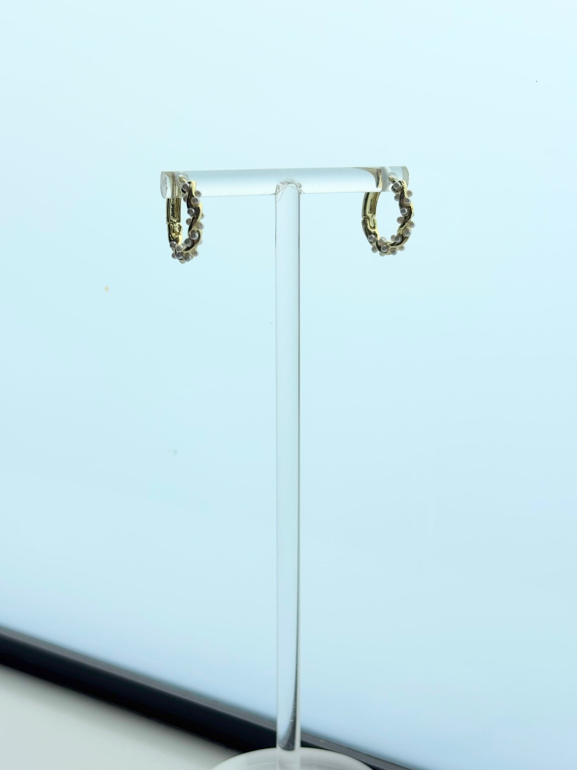 These small gold-tone hoops are carefully accented with tiny white pearls, creating a soft, organic texture that feels both feminine and modern. Their delicate size makes them perfect for everyday wear, while the pearl detailing adds just the right touch of sophistication.