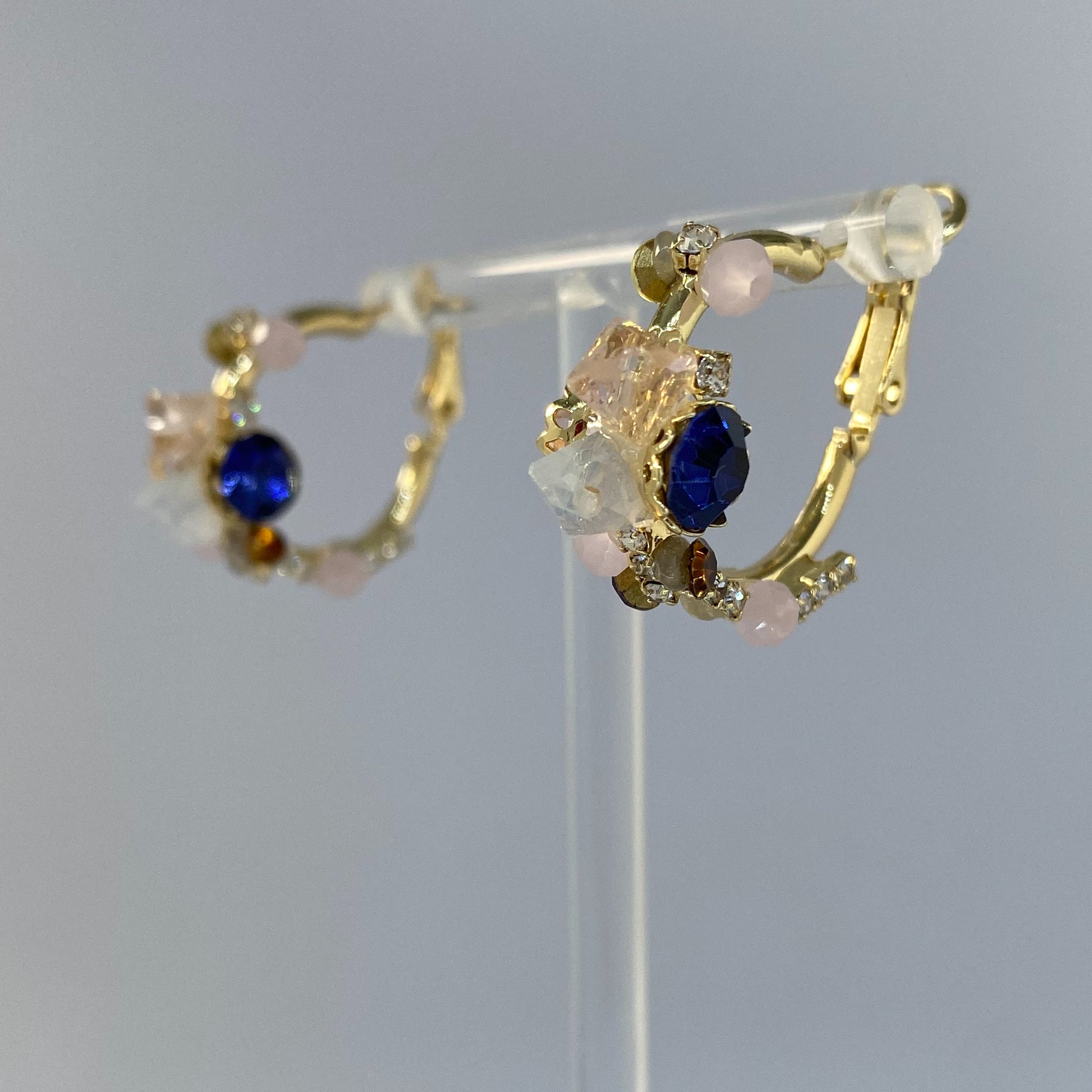 Crafted with a polished gold hoop base, each earring is richly adorned with a deep sapphire-blue centerpiece gem, surrounded by a mix of soft pink beads, champagne gems, milky white stones, and clear rhinestones. The result is a lively, feminine, and statement-making piece that feels both whimsical and refined.