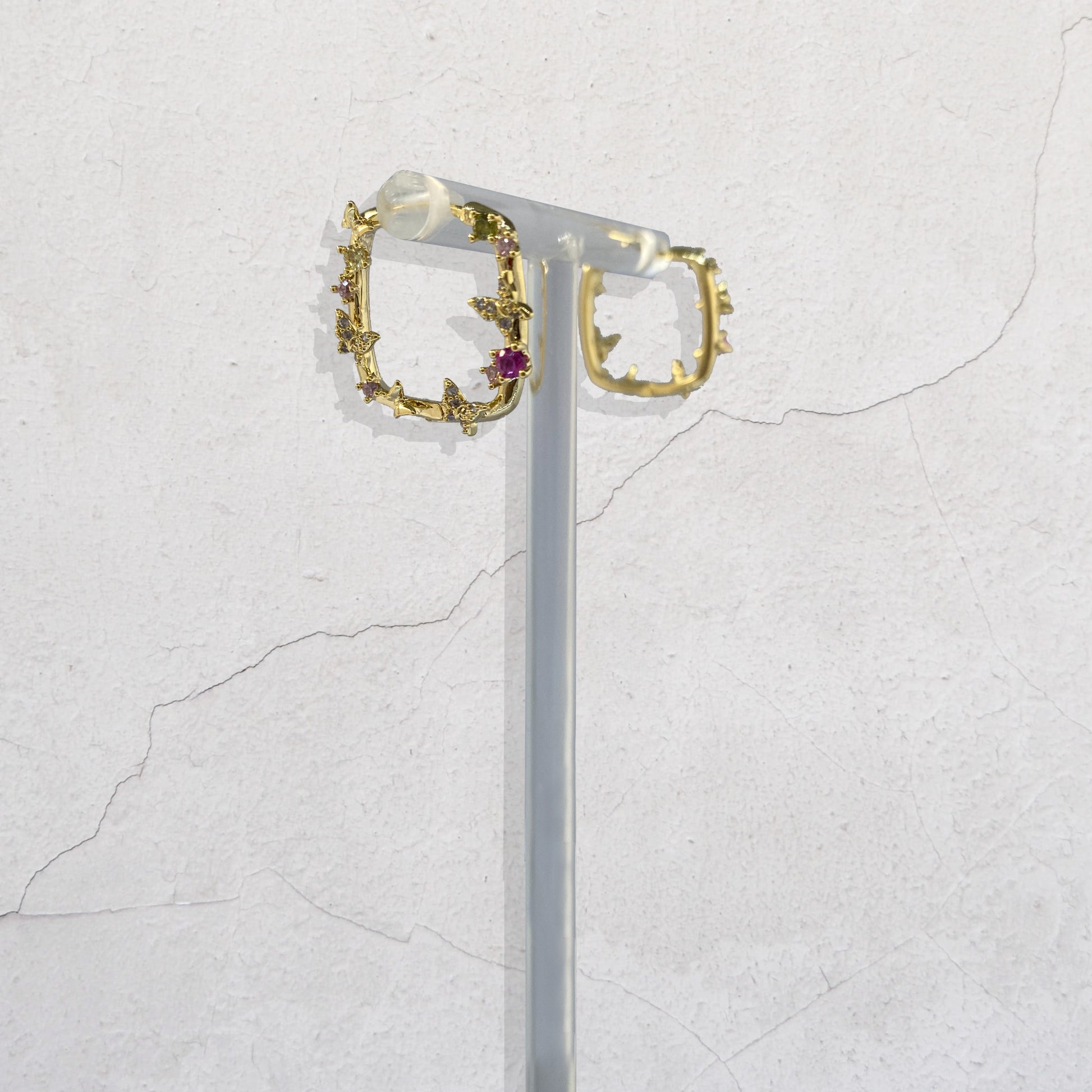 Crafted in polished gold-tone, these earrings feature tiny butterfly accents perched around the hoop, each glimmering with clear and pink crystals. Their design blends romance and whimsy, perfect for those who love jewelry that feels light, feminine, and expressive.