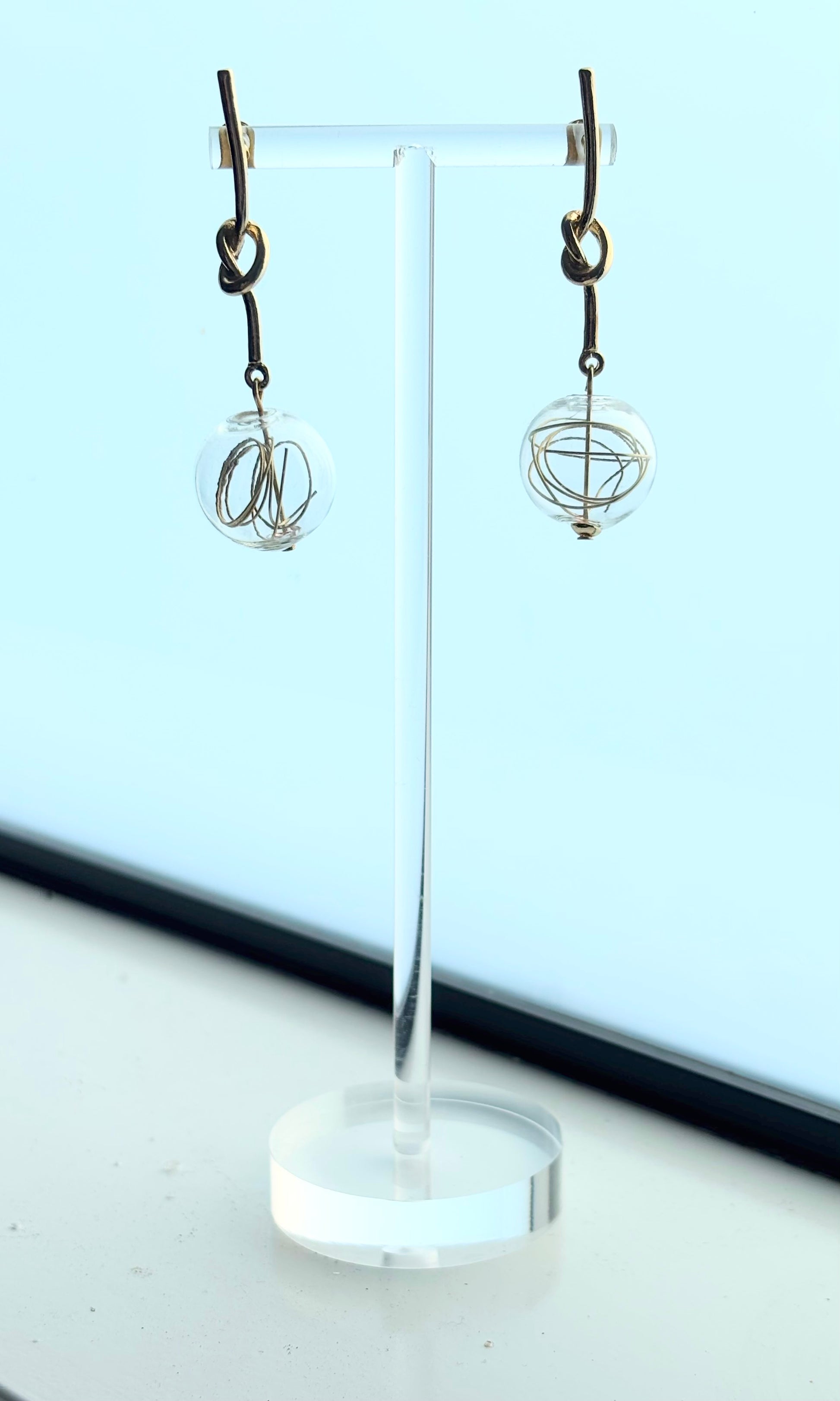 Each piece features a knotted gold-tone stem that holds a clear glass orb, inside which delicate floating wire spirals dance with the light. Sculptural and lightweight, they feel like miniature planets in orbit, bringing a dreamy, contemporary edge to your look.
